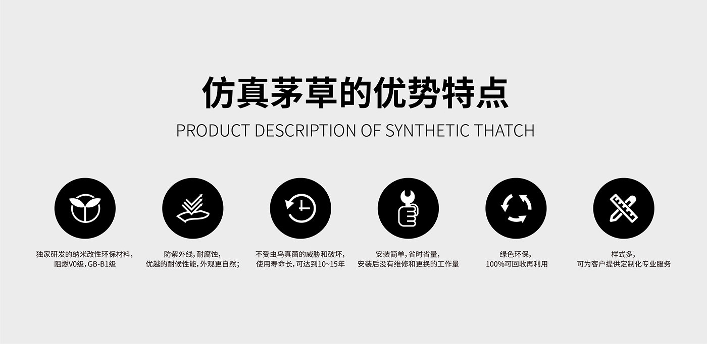 ? ? ? ? 仿真茅草是深圳市科佰工貿(mào)有限公司采用目前國際上先進的納米合成高分子材料技術(shù)和工藝生產(chǎn)。利用納米粒子的特有的物理化學性質(zhì),使得其具有更加優(yōu)異的耐候性及阻燃性,能滿足美國ASTM-G154-06 抗UV老化測試標準,并能通過美標UL94-V0級阻燃,在國內(nèi)仿真茅草也通過了國家防火建材阻燃測試B1級。?