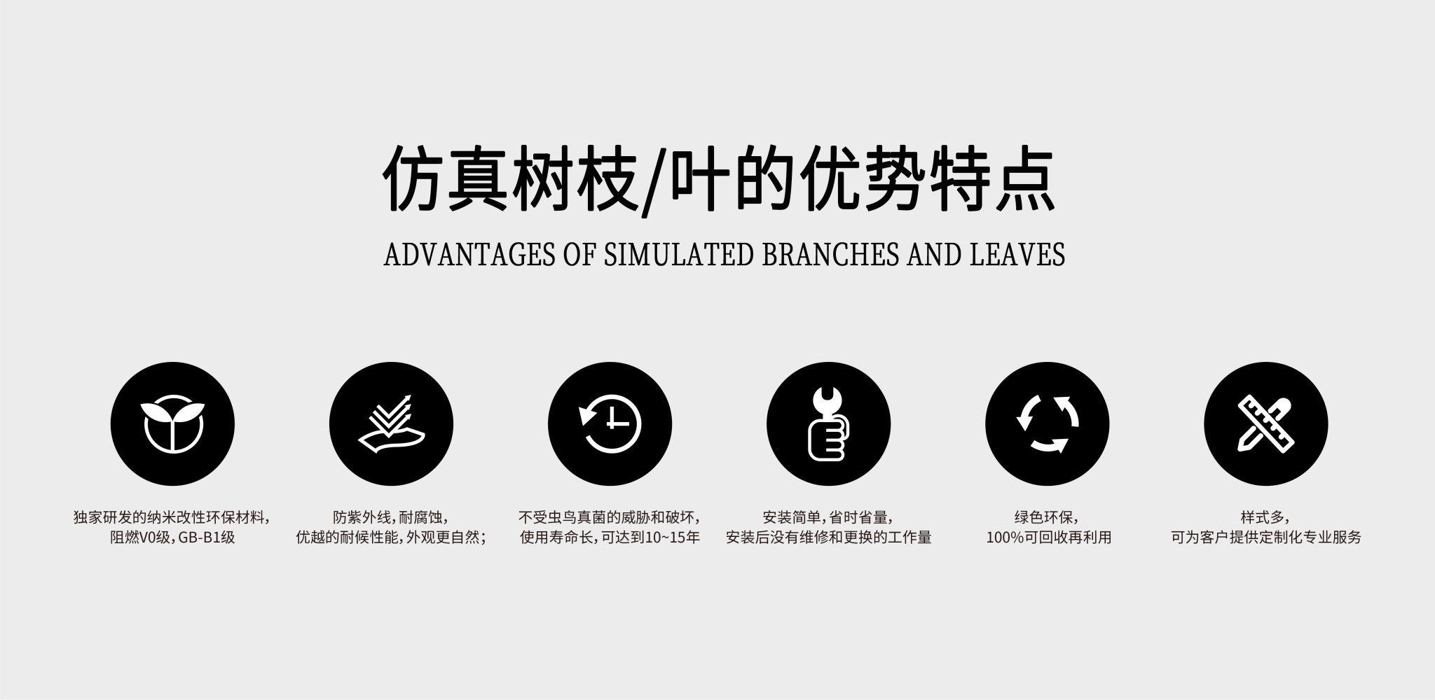 ? ? ? ? 仿真樹枝葉是深圳市科佰工貿有限公司采用目前國際上先進的納米合成高分子材料技術和工藝生產。利用納米粒子的特有的物理化學性質,使得其具有更加優(yōu)異的耐候性及阻燃性,能滿足美國ASTM-G154-06 抗UV老化測試標準,并能通過美標UL94-V0級阻燃,在國內仿真樹枝葉也通過了國家防火建材阻燃測試B1級。?