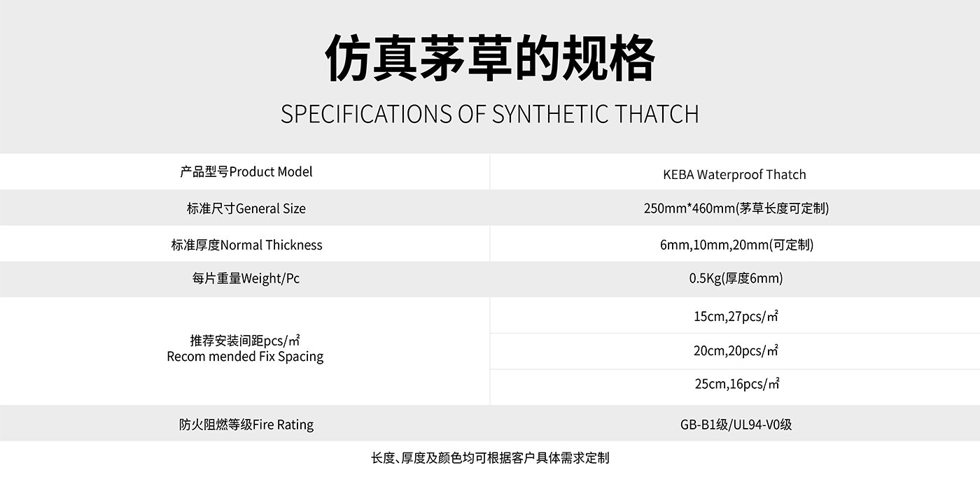 ? ? ? ? 防水仿真茅草是深圳市科佰工貿(mào)有限公司采用目前國際上先進(jìn)的納米合成高分子材料技術(shù)和工藝生產(chǎn)。利用納米粒子的特有的物理化學(xué)性質(zhì),使得其具有更加優(yōu)異的耐候性及阻燃性,能滿足美國ASTM-G154-06 抗UV老化測試標(biāo)準(zhǔn),并能通過美標(biāo)UL94-V0級阻燃,在國內(nèi)仿真茅草也通過了國家防火建材阻燃測試B1級。?